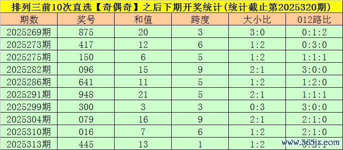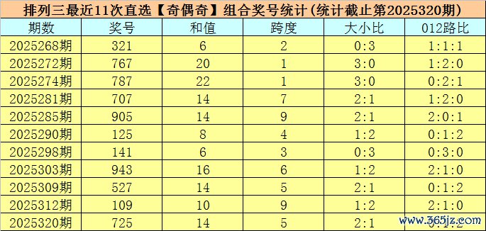开奖总结:摆设三第2025320期开出奖号:725,类型为组六,和值为14,奇偶比为2:1,大小比为2:1,跨度为5。